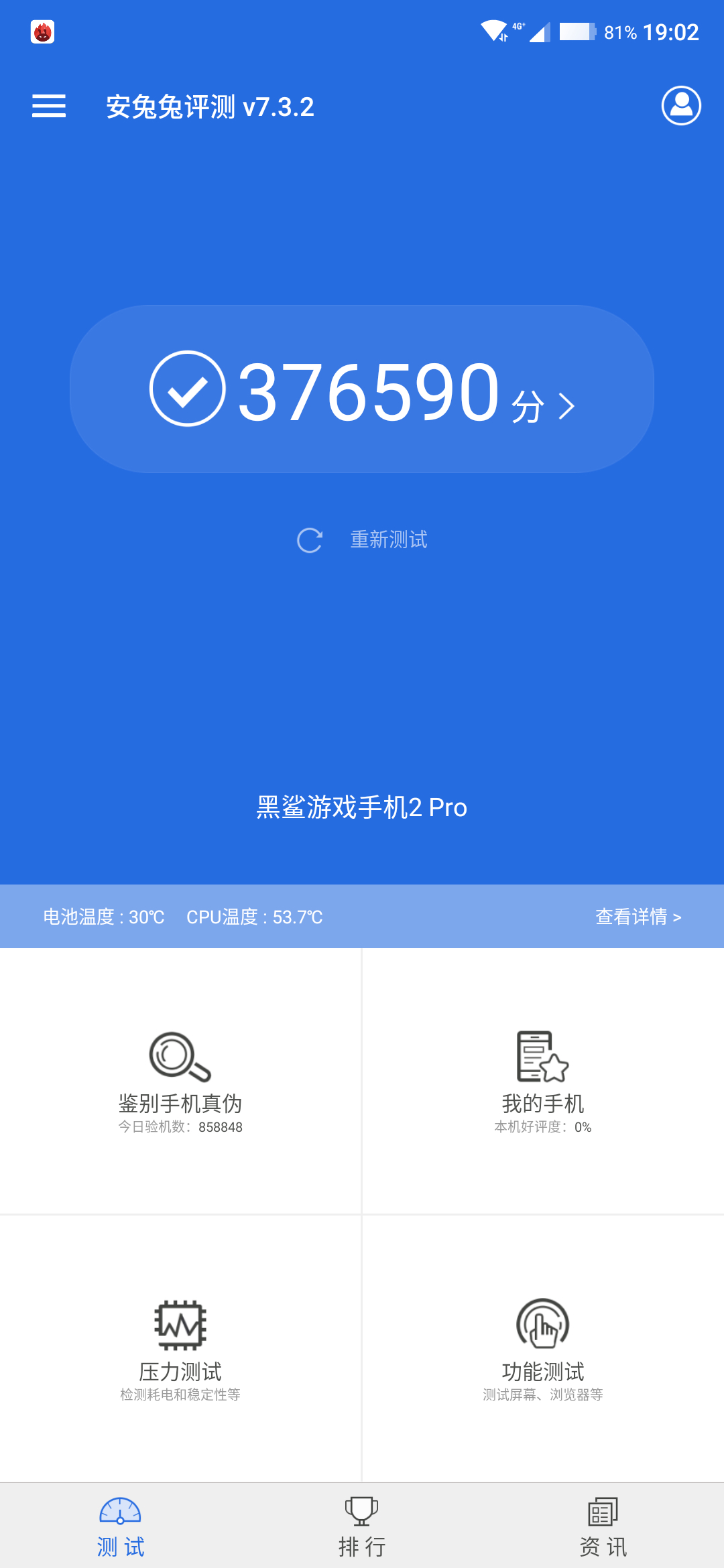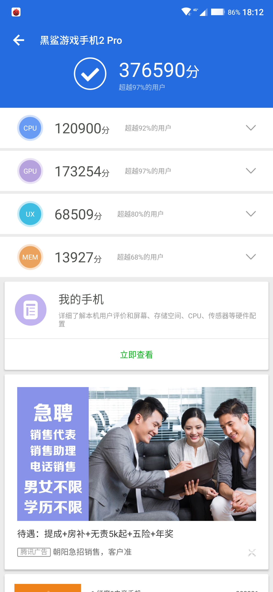 黑鲨游戏手机2 Pro搭载高通最新发布的骁龙855+旗舰级处理器,标配12GB+128GB存储,并提供最高12GB+256GB存储组合。跑分效果如下: