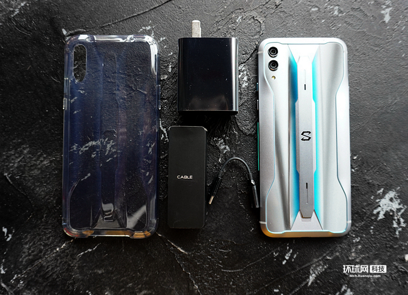 打开包装,黑鲨游戏手机2 Pro的包装内容为:手机主机*1、电源适配器*1、USB Type-C To Audio转接线*1、插针*1、保护壳*1以及入门指南与三包凭证。
